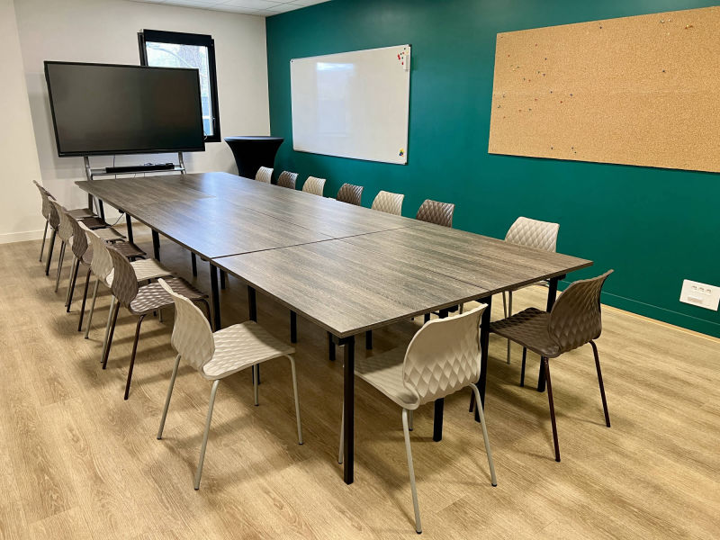 Plusieurs configurations possibles selon vos besoins et du nombre de participant(e)s (en Atelier, en Rectangle, en U, en Plénière).